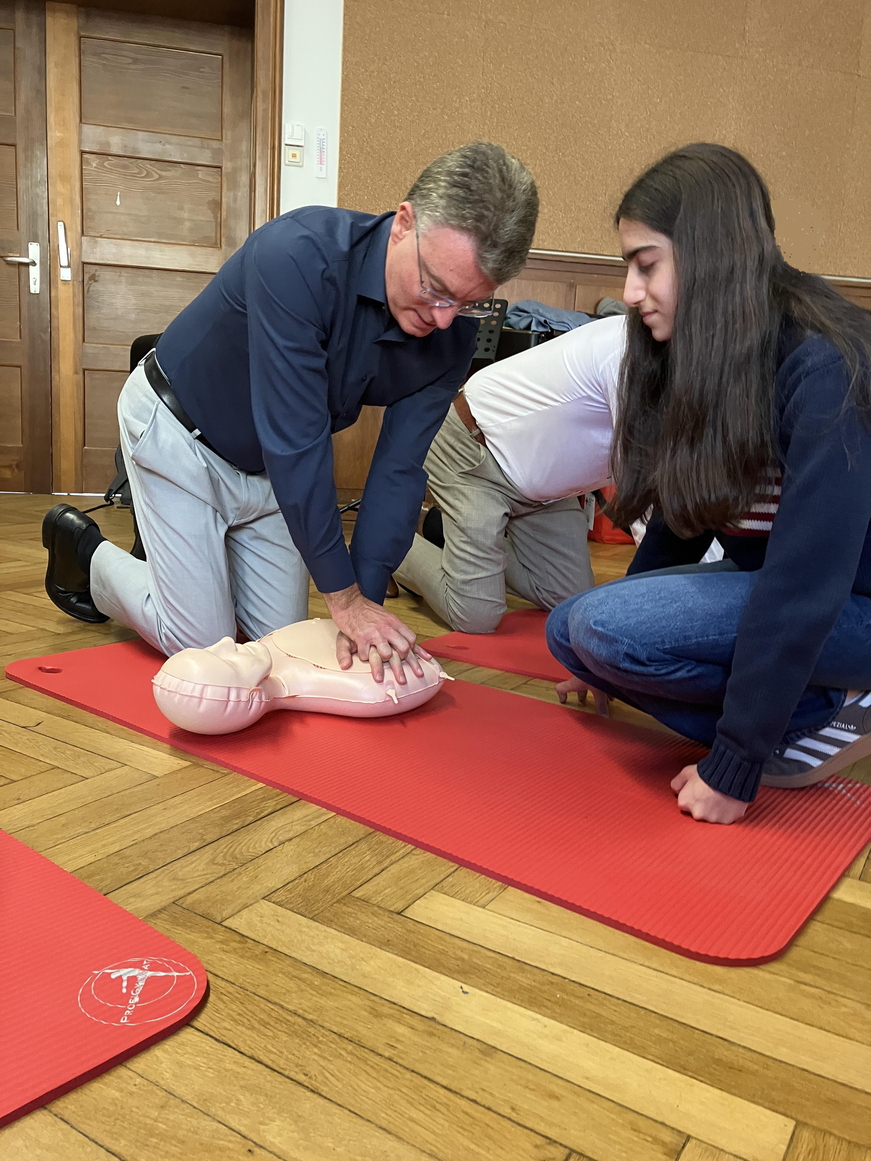 Im Mittelpunkt der Schulungen stand die Vermittlung der einfachen und lebenswichtigen Handlungsabfolge „Prüfen – Rufen – Drücken“. Professor Diehl erklärte anschaulich, dass der erste Schritt darin besteht, zu überprüfen, ob eine bewusstlose Person auf lautes Ansprechen oder Schütteln reagiert und ob sie atmet. Sollte dies nicht der Fall sein, ist es unabdingbar, sofort den Notruf zu wählen.