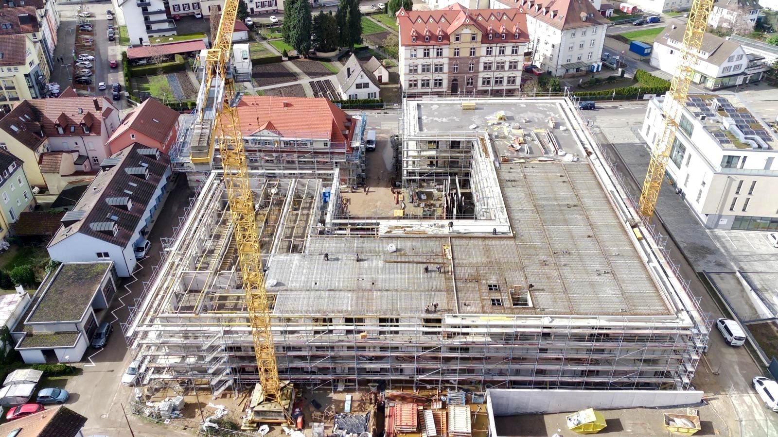 Im März 2023 konnten der Ortenaukreis und das Ortenau Klinikum mit dem symbolischen Spatenstich die Arbeiten für den Neubau des Zentrums für Gesundheit (ZfG) Gengenbach einleiten. Rund ein Jahr später stehen die Rohbauarbeiten jetzt bereits kurz vor dem Abschluss. Der fast quadratische Gebäudekomplex mit seinem Innenhof ist inzwischen deutlich zu erkennen und fügt sich auf dem Gelände der ehemaligen Klinik harmonisch zwischen dem historischen „Alten Spital“ und dem Gesundheitsamt entlang der Leutkirchstraße ein. Nach dem demnächst beginnenden Kranabbau werden die restlichen Grundleitungen verlegt und die Verfüllarbeiten abgeschlossen. Im Anschluss folgen die Dachabdichtungs- und Fensterbauarbeiten, damit innerhalb des Gebäudes die Arbeiten an den Ausbaugewerken folgen können.